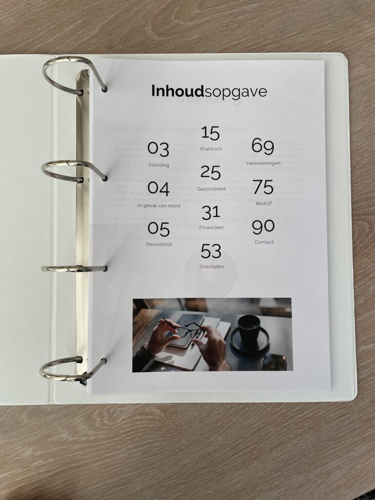 Met de Levensmap breng je orde in jouw belangrijke documenten, van zakelijke en privécontracten tot verzekeringen, wachtwoorden en persoonlijke wensen. Dit is geen standaard nalatenschapsdossier, maar een praktisch en waardevol hulpmiddel voor het dagelijks leven én de toekomst. In geval van nood hoeven je dierbaren straks nog maar 1 map uit de kast te trekken, zodat ze direct en gericht in actie kunnen komen.